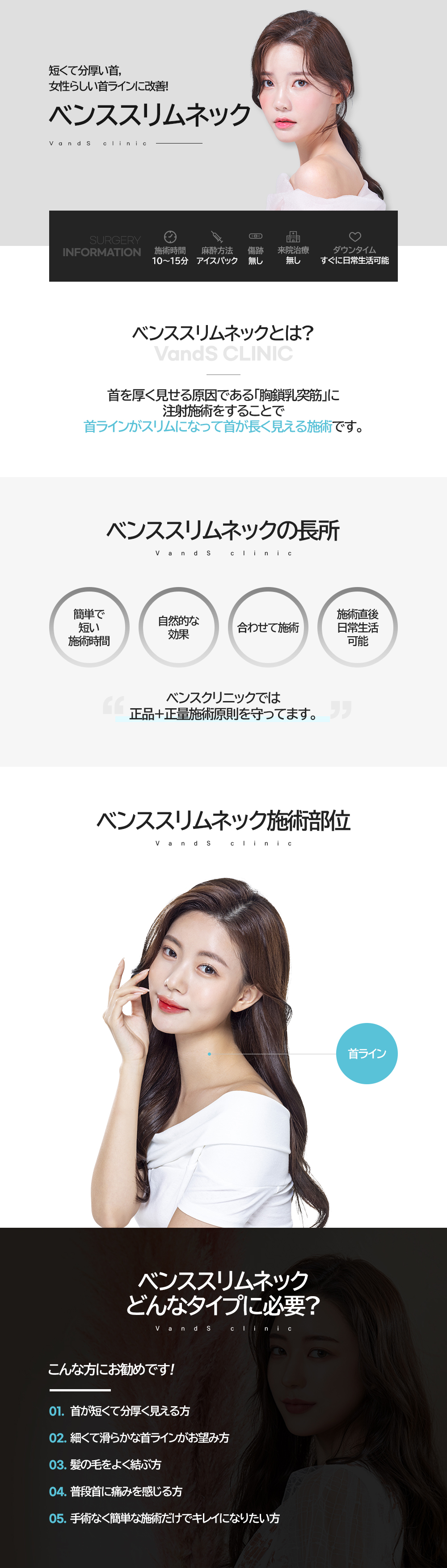 首が太く見えてしまう原因である首斜筋(胸鎖乳突筋)に注射施術を行い、首のラインが細くなり、首が長く見える施術です。